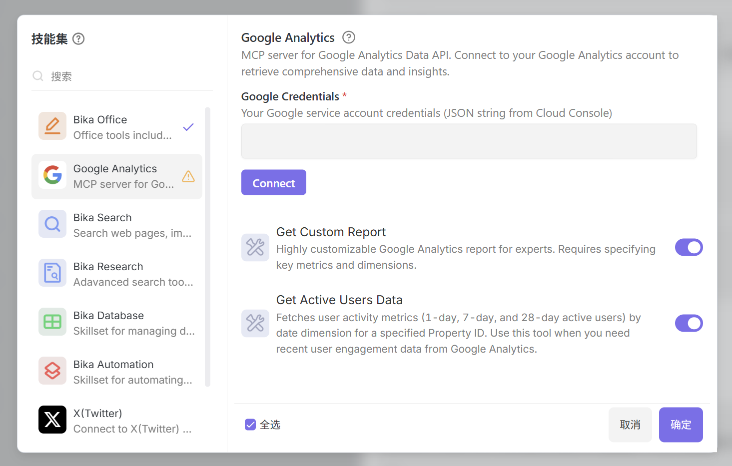Open the Google Analytics skillset configuration page in Bika (the Google Analytics skillset).