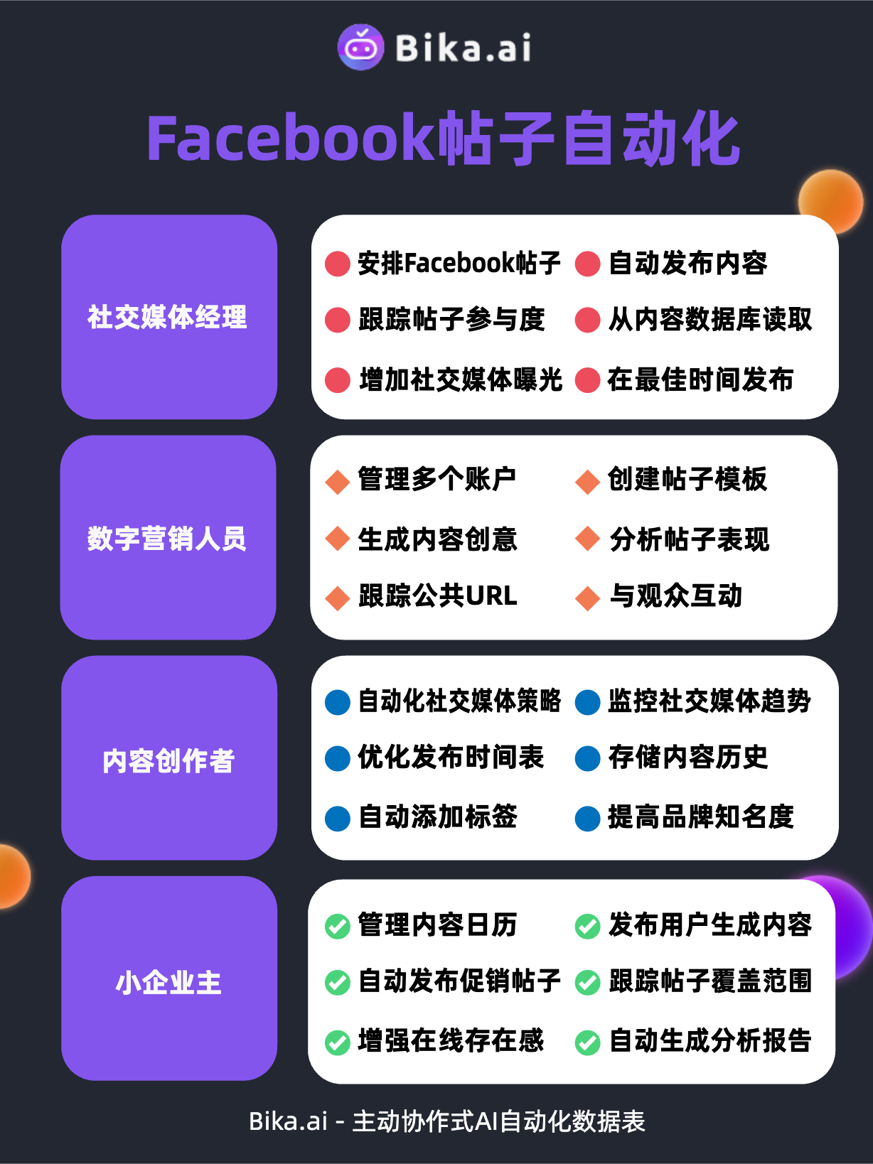 Bika.ai 推出的 Facebook 帖子自动化模板为团队带来了福音。这一模板不仅免费使用,而且在提高效率方面表现出色。