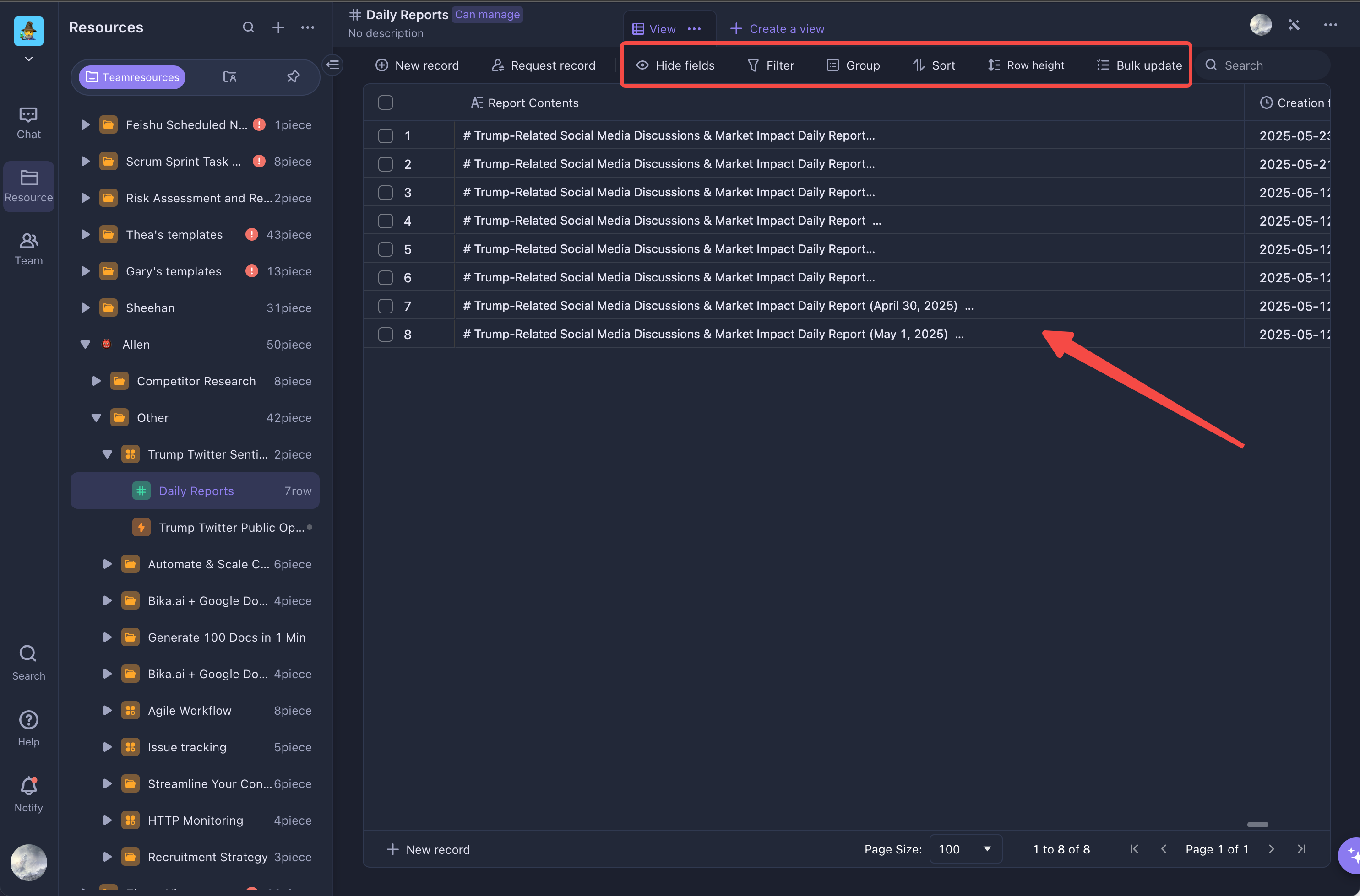 - 查看历史报告:打开“每日报告”数据表,通过表格视图筛选日期或关键词,支持手动编辑补充内容。