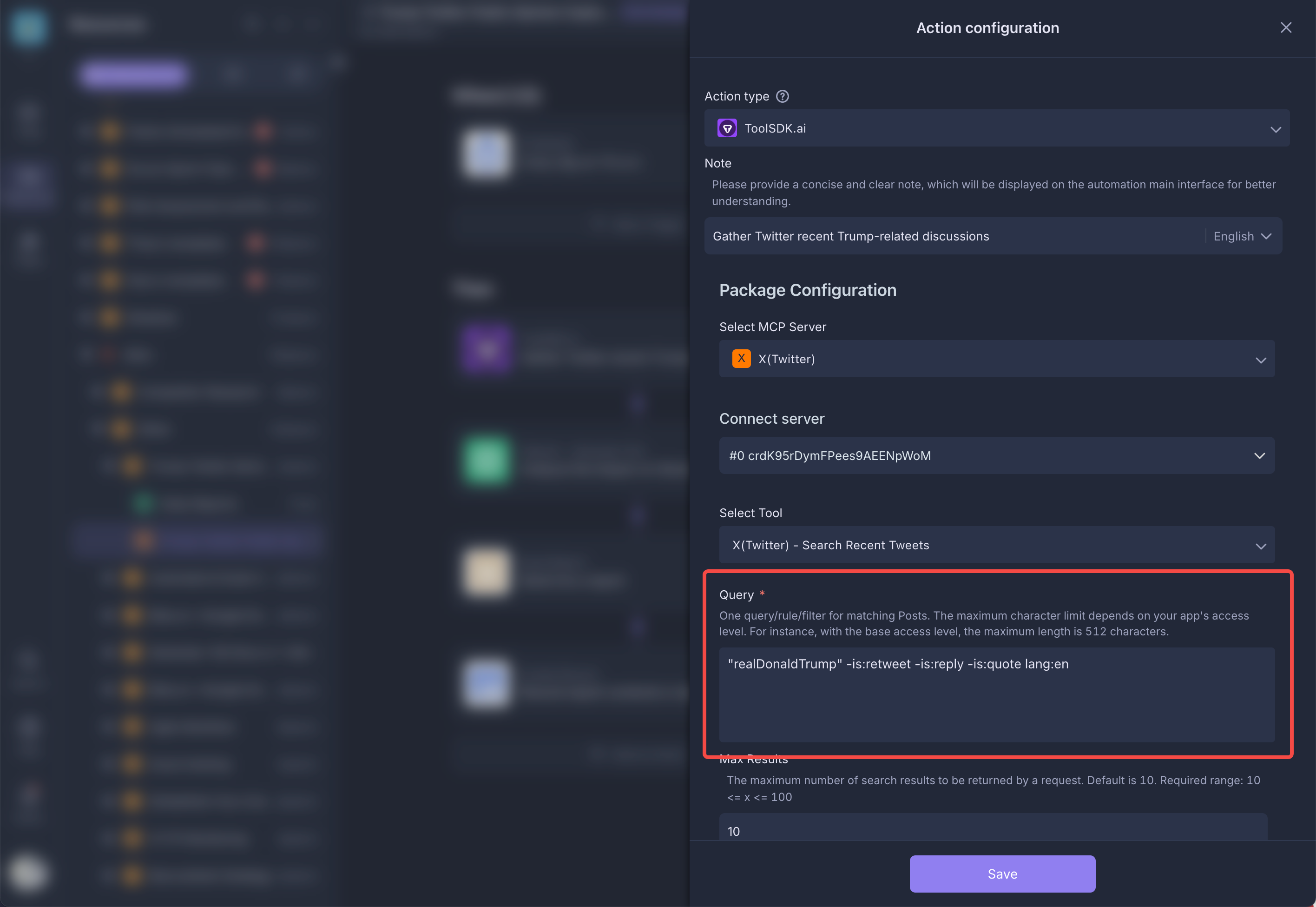 - 特朗普推特舆情抓取 - AI 分析 - 报告生成:此自动化流程集成了 Bika.ai 与 ToolSDK.ai,其核心功能是自动化抓取特朗普最近 7 天内的 10 条相关推文(受免费版限制),然后借助 AI 生成结构化报告,分析这些推文对美股及关联概念股的短期波动与长期趋势影响,报告中包含风险预警与投资建议。